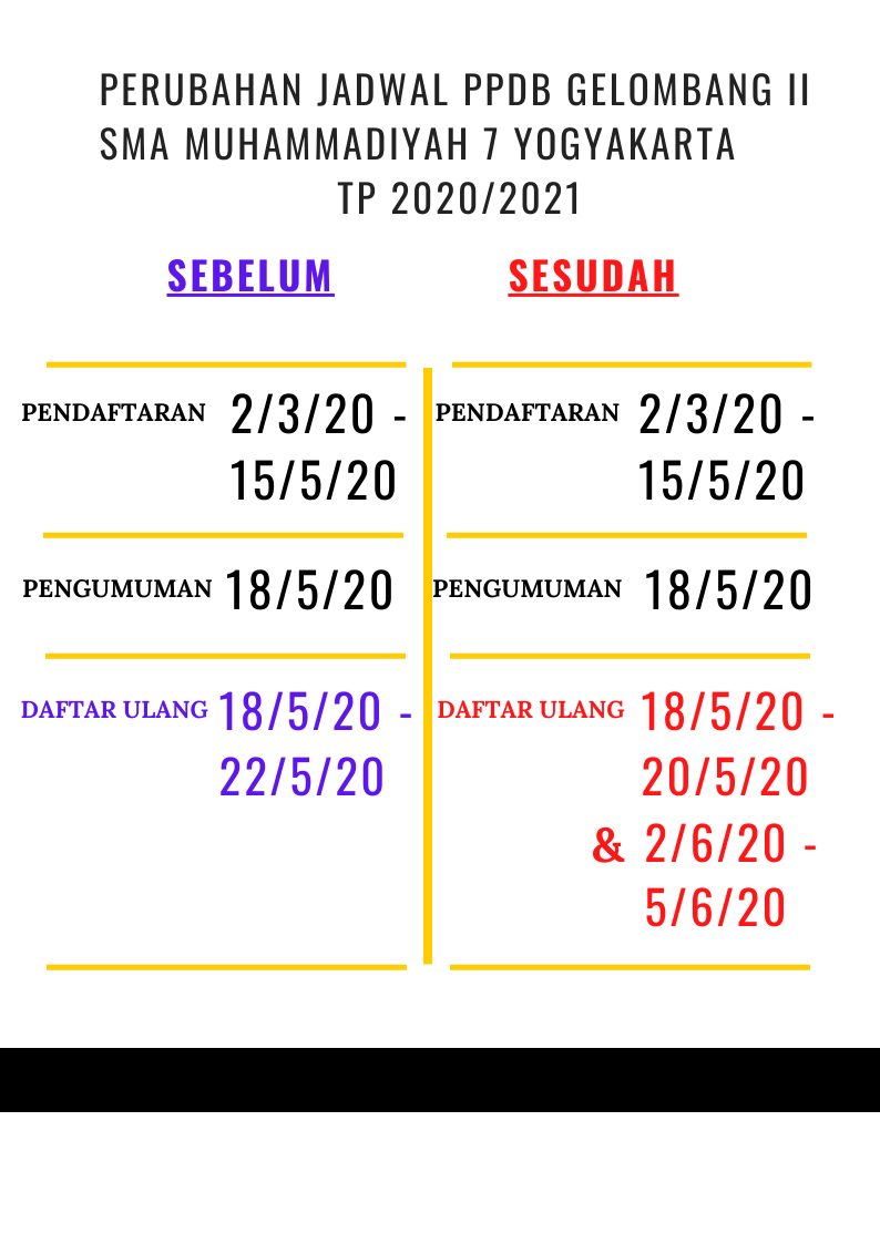 Kami sampaikan bahwa telah terjadi perubahan jadwal Penerimaan Siswa SMA Muhammadiyah 7 Yogyakarta Gelombang II Tahun Pelajaran 2020/2021. Dimana diketahu bahwa jadwal semula daftar ulang yaitu tertanggal 18 Mei 2020 - 22 Mei 2020 dirubah menjadi tanggal 18 Mei 2020 - 20 Mei 2020 dilanjutkan tanggal 2 Juni 2020-5 Juni 2020.