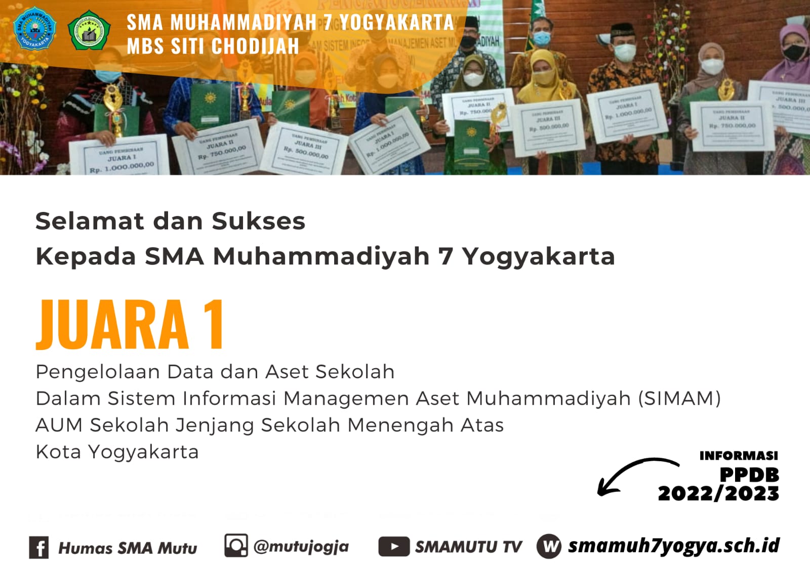SMA Muhammadiyah 7 Yogyakarta mendapatkan kabar baik pada hari Sabtu, 18 September 2021. Bermula dari undangan yang dikirimkan oleh Pimpinan Daerah Muhammadiyah (PDM) Kota Yogyakarta untuk menghadiri acara Penganugerahan Penghargaan Pengelolaan Data dan Aset Sekolah Tahun 2021, SMA Muhammadiyah 7 Yogyakarta mendapatkan Juara I dalam kegiatan tersebut. Kegiatan Pengelolaan Data dan Aset Sekolah dalam Sistem Managemen Aset muhammadiyah (SIMAM) diselenggarakan oleh PDM Kota Yogyakarta untuk Amal Usaha Muhammadiyah (AUM) Sekolah mulai jenjang SD/MI, SMP/MTs dan SMA/SMK/MA di Kota Yogyakarta. Kegiatan ini telah berlangsung selama 1 (satu) tahun dengan penilaian secara berkala oleh PDM Kota Yogyakarta yang bekerja sama dengan Majelis Wakaf dan Kehartabendaan (MWK) Pimpinan Wilayah Muhammadiyah (PWM) D.I.Yogyakarta. Pengelolaan Data dan Aset Sekolah melalui Sistem SIMAM diharapkan dapat menjadi langkah digitalisasi data di lingkungan Persyarikatan Muhamamdiyah, khususnya dalam membangun database Aset Sekolah.